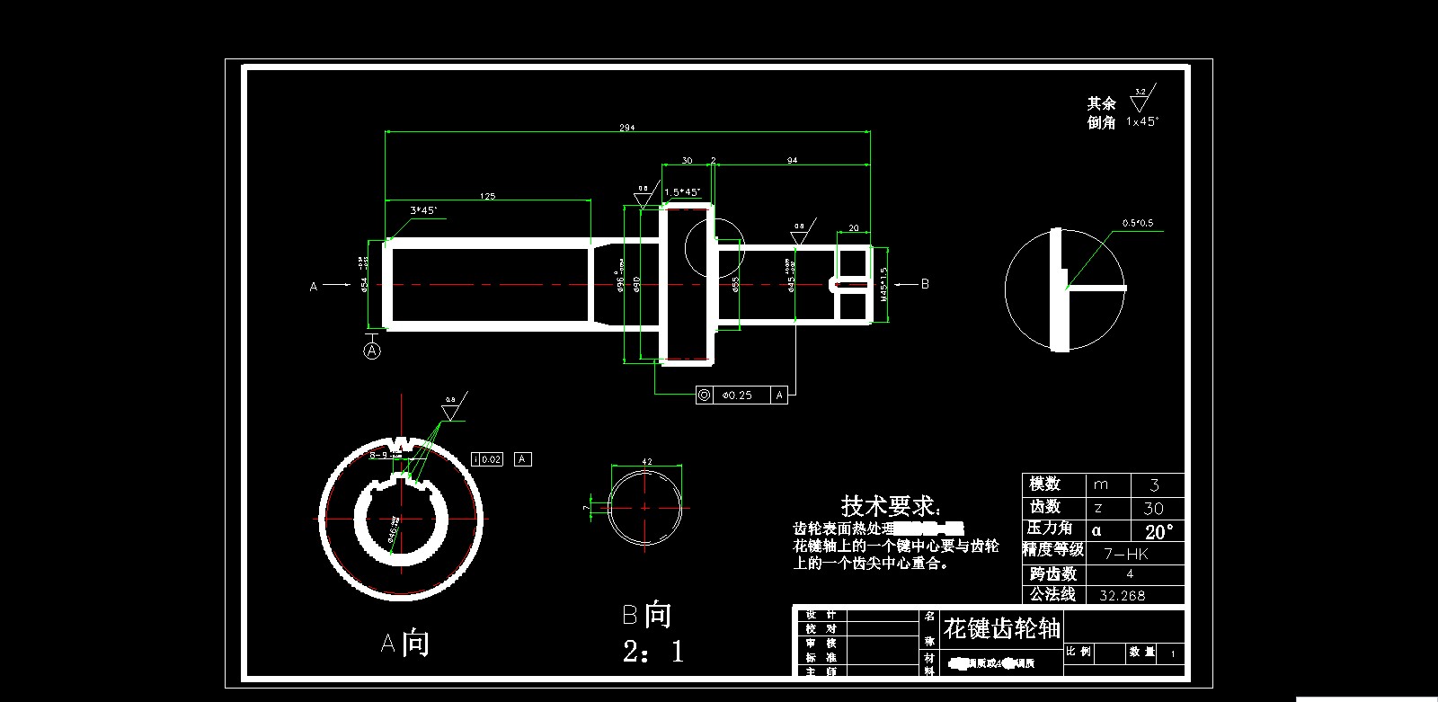 花键齿轮轴的文件格式为dwg,文件打开参考AutoCAD软件,此图纸模型关键词:花键,齿轮轴,下载